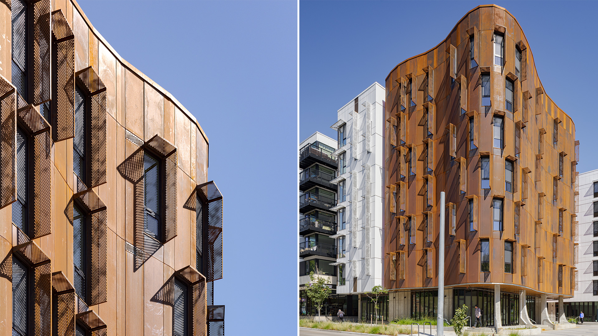 De organiska, böljande formerna är inspirerade av afrikansk arkitektur – och var stora favoriter under olika design-workshops med lokalbefolkningen som arrangerades inför uppförandet av Africatown Plaza. Vågformen har integrerats där fasaden har maximal synlighet. Det tydligaste exemplet är den svängda fasaden mot 23rd Avenue. Här stoltserar ett ikoniskt volymelement i väderbeständigt stål som markerar hörnet och svävar över torget likt en trädkrona. Det skapar både skydd och en samlingsplats för de boende. På nära håll ser man att fasaden har en sömlös yta, sammansatt av dussintals specialtillverkade metallpaneler – var och en formad och monterad med hög precision av BŌK Modern.