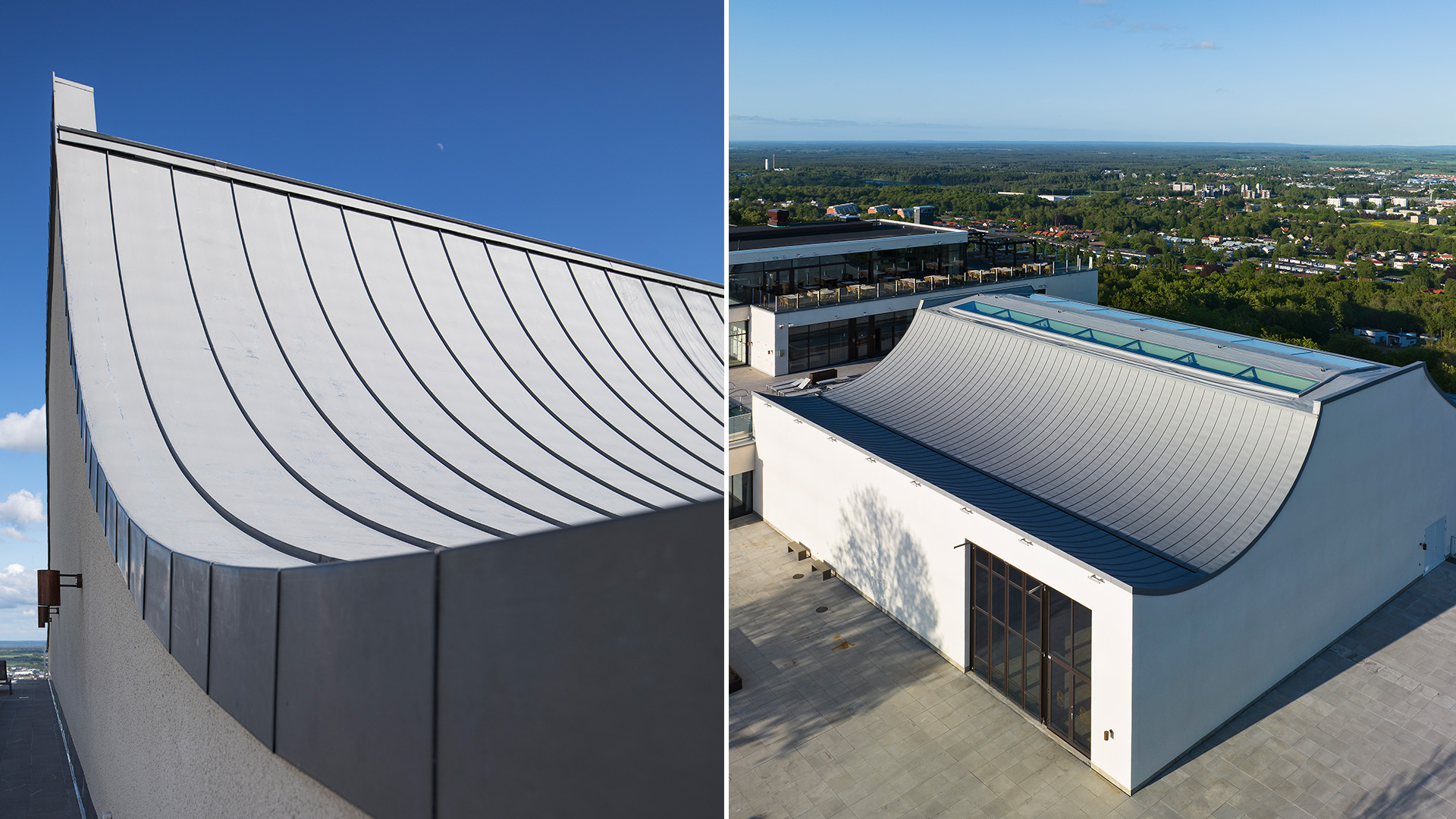 Det unika taket på nybyggda Bergasalen är ett sadeltak med konkav bågform och för osökt tankarna till ett asiatiskt tempeltak. Materialet är en förpatinerad ljusgrå zink vars längder har specialtillverkats för att få den rätta konkava formen. De längsta skivorna behövde vara över 11 meter långa och krävde ett stadigt men försiktigt handlag för en lyckad montering.