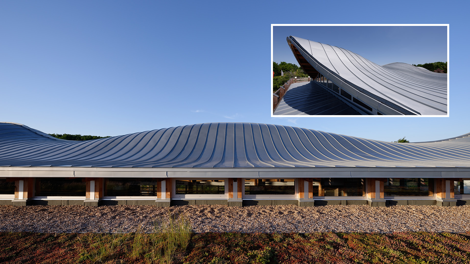 Därför har man låtit taket över nybyggnationen till det franska buddistcentret gå fram som en stor våg, i samklang med områdets mjuka linjer i det kuperade landskapet. Formen krävde ett komplext utförande där två tredjedelar av taket består av konkava och konvexa plåtar. Byggnaden är ett långsiktigt projekt och har uppförts med material som tål åldrande och kräver ett minimalt underhåll, och därav har det 550 m2 stora taket klätts med zink. För att fullborda integrationen med landskapet valdes förpatinerad blågrå zink.