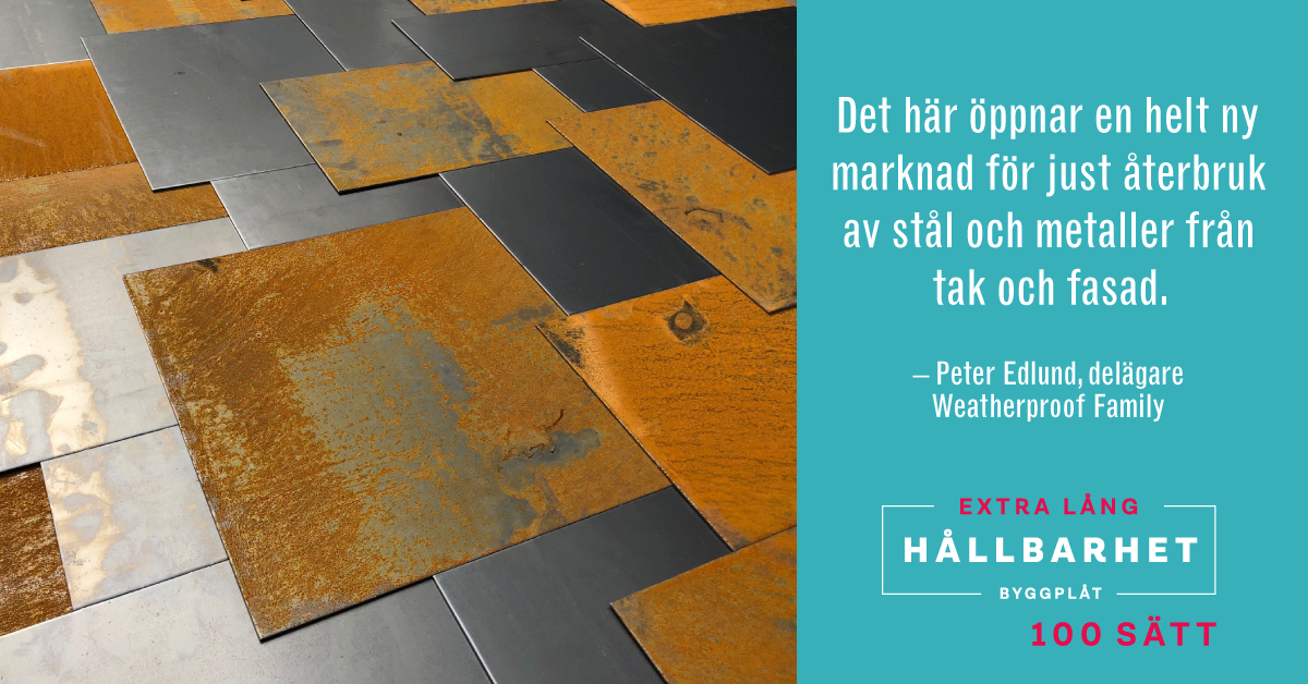 Med Weatherproof Familys nya fasadsystem kan både spillmaterial och återbrukad plåt återuppstå som nya fasader. Peter Edlund, en av tre delägare i företaget hoppas på att få samarbeta med arkitekter och fastighetsägare om kreativa förslag.
